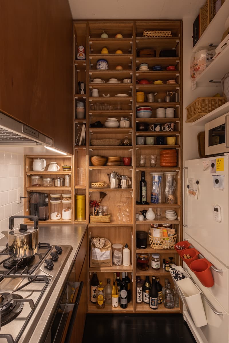 棚に道具があふれる楽しいキッチン